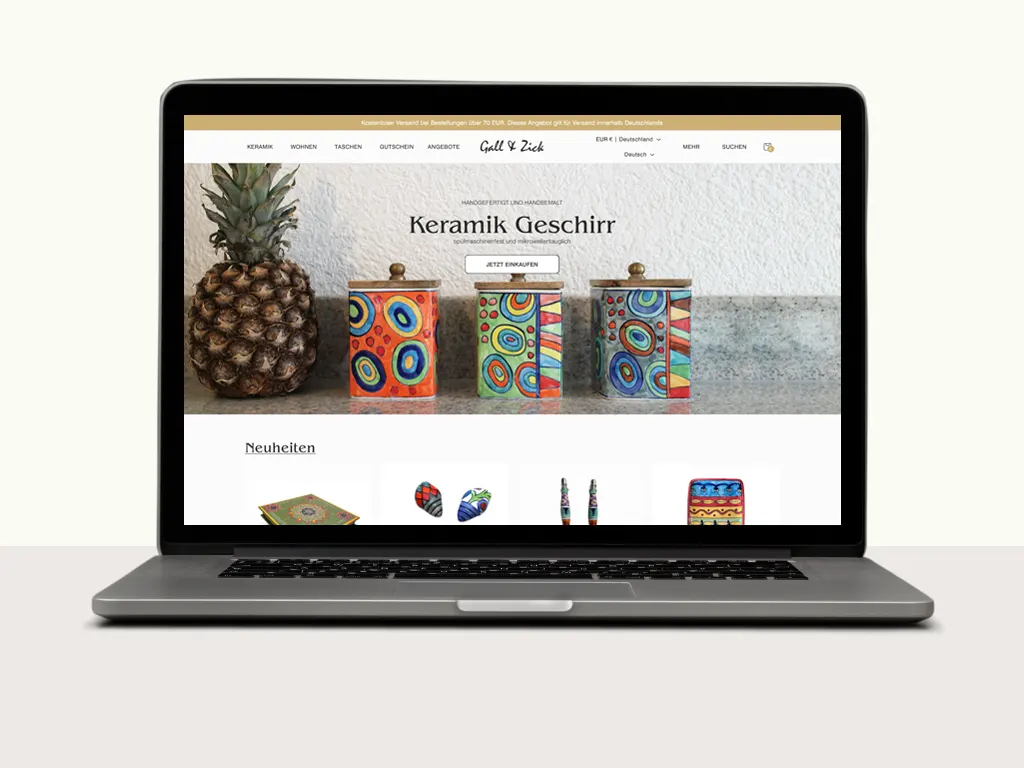 Laptop displaying a sweets website featuring a colorful donut topped with nuts, highlighting tradition and best sellers.